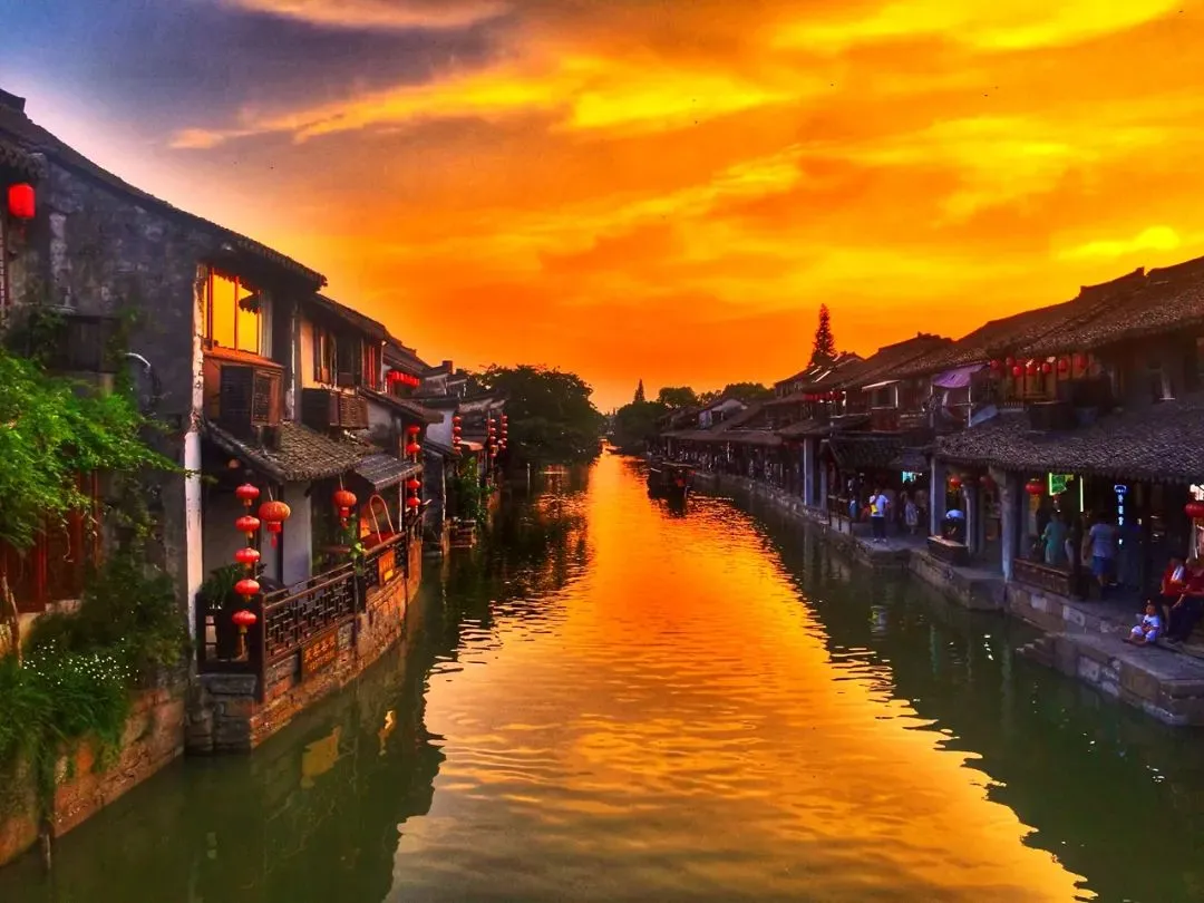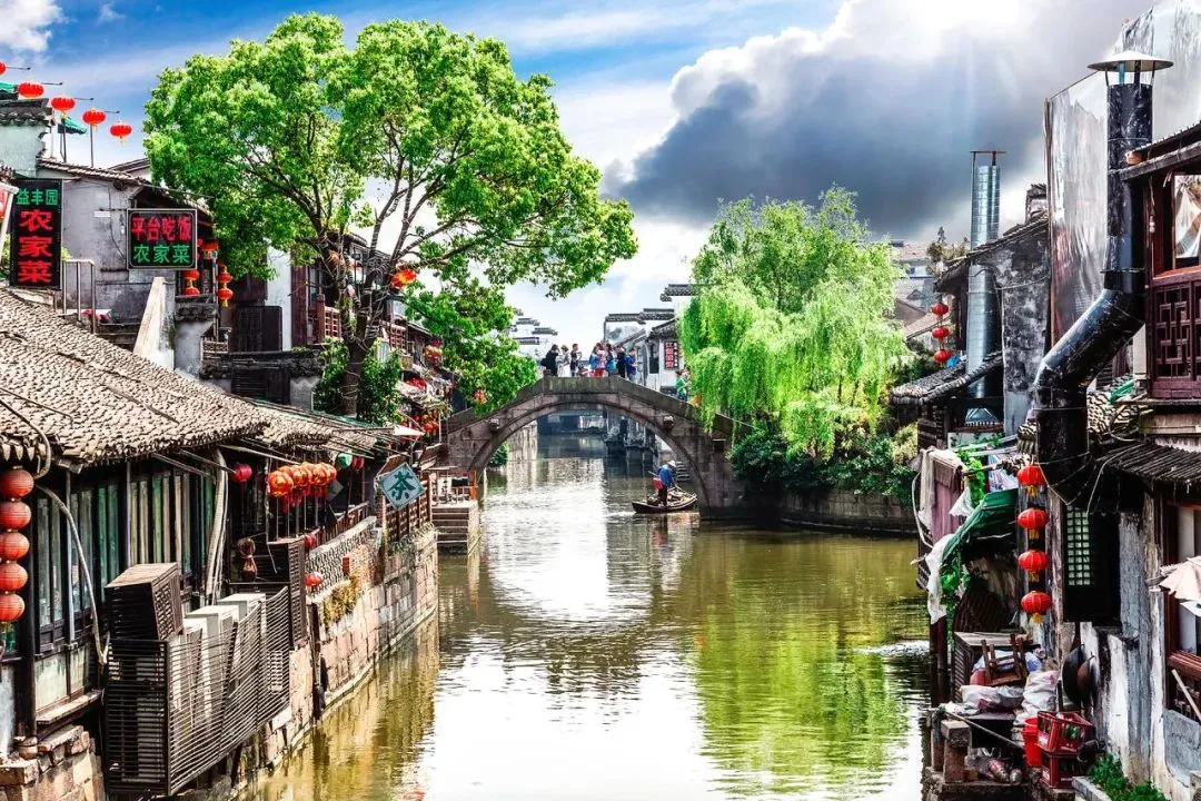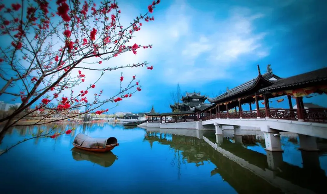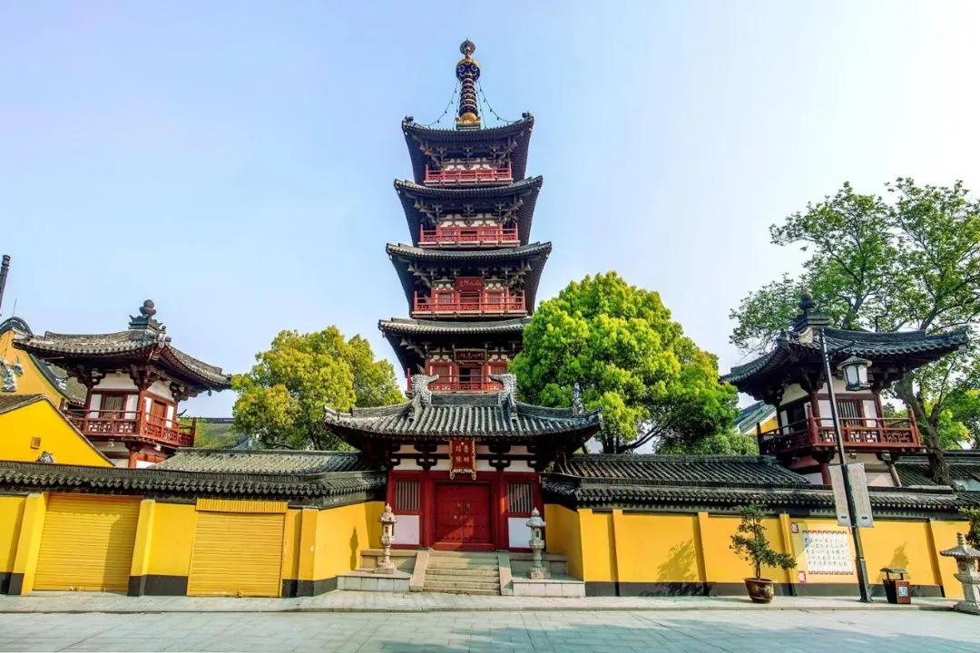 “姑苏城外寒山寺,夜半钟声到客船。”的寒山寺景区和枫桥。位于苏州市姑苏区的千年古刹——寒山寺,始建于南朝萧梁代天监年间,初名“妙利普明塔院”。寒山寺属于禅宗中的临济宗。唐代贞观年间,当时的名僧寒山、拾得两位高僧创建寒山寺。历史上寒山寺曾是中过十大名寺之一,寺内古迹甚多,有张继诗的石刻碑文,寒山、拾得的石刻像,江南“四大才子”唐伯虎、文徵明所书碑文残片等。寒山寺殿宇大多为清代建筑,主要有大雄宝殿、藏经楼、钟楼、碑廊、枫江楼、霜钟阁等。寒山寺的建筑布局没有严格的中轴线。寒山寺山门前面的石拱圈古桥是江村桥,桥堍与山门之间那垛黄墙称照壁。山门两旁两棵古樟。黄墙内古典楼阁飞檐翘角,右为枫江楼,左为霜钟楼,都源于枫桥夜泊诗。佛龛背后一尊威风凛凛的将军像,面朝里,对着大雄宝殿,手拿金刚杵,也叫降魔杵,那是韦驮,位居四大天王手下的三十二神将之首。