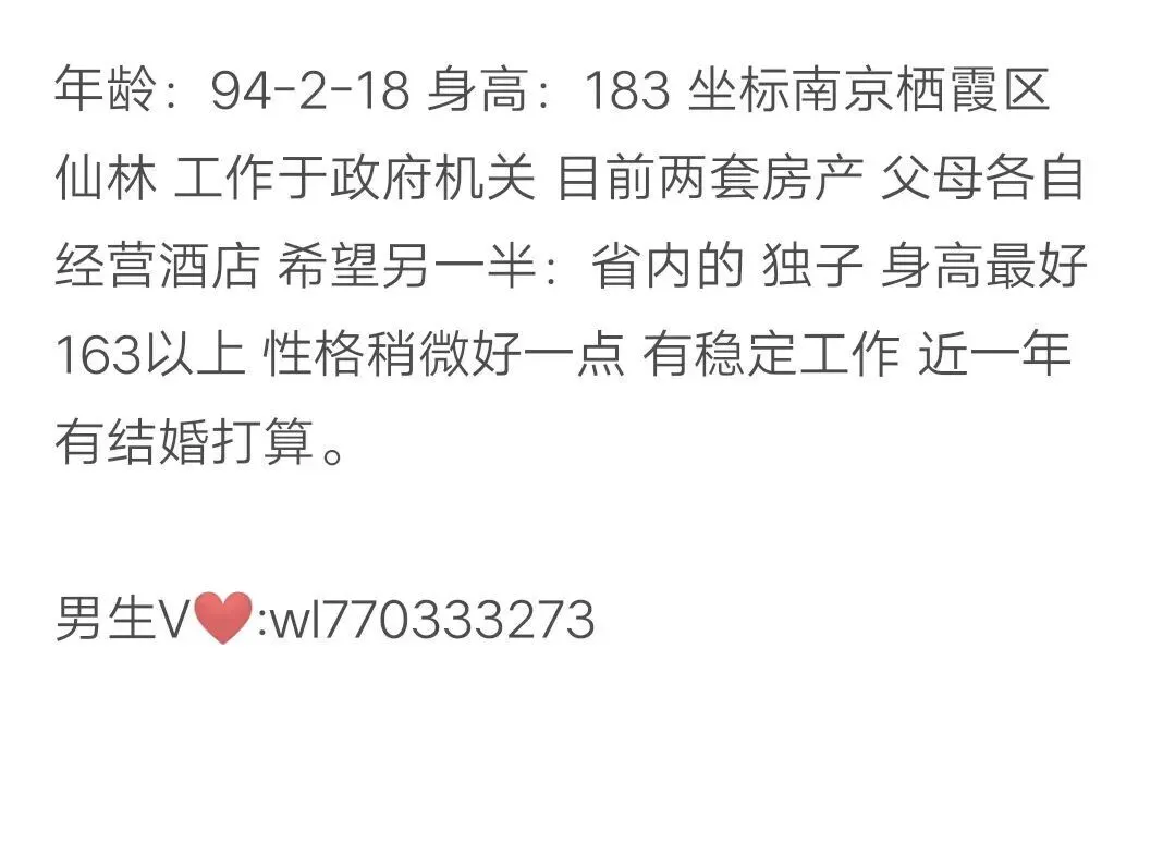⑤、【南京月老爷爷牵线(4866)】女,92年,身高162,目前单身,有房,南京浦口人,想找个有独立婚房、年入不低于18万的男友。