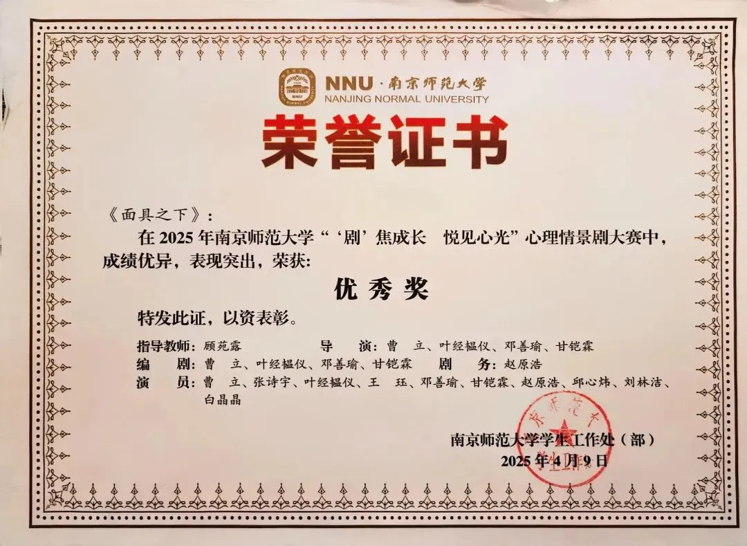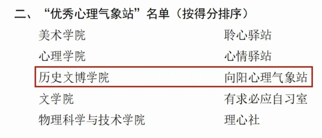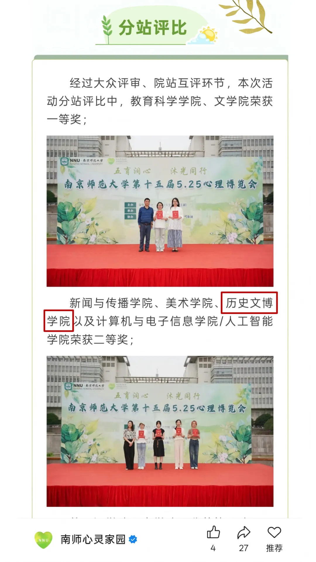 在南京师范大学2025年度心理健康教育工作考评中,历史文博学院获评“心理健康教育工作先进集体”,学院向阳心理气象站获评“优秀心理气象站”。