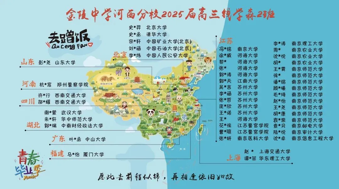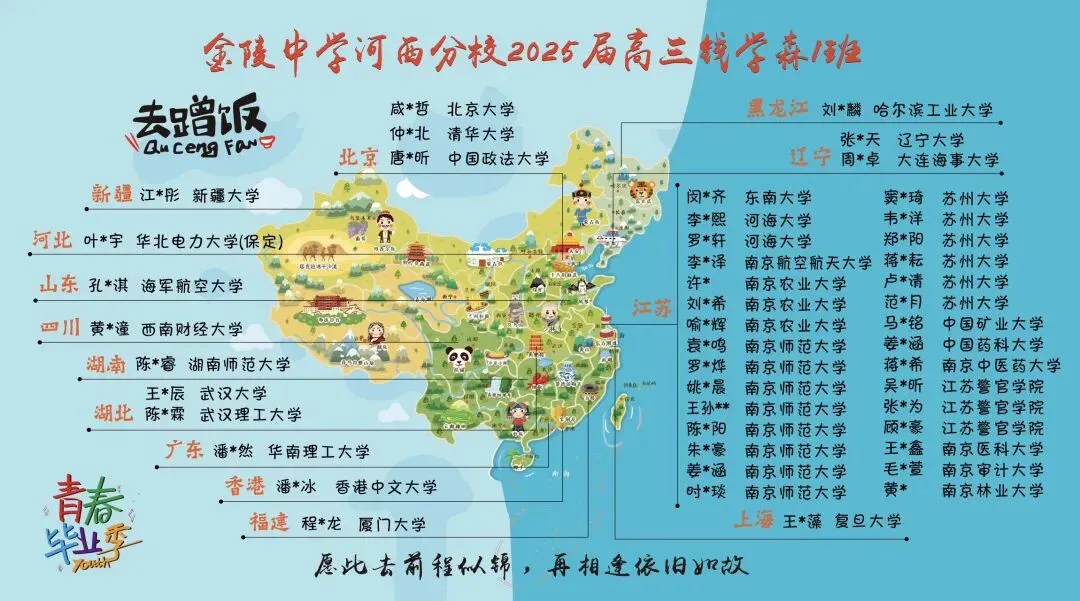 2025 届高三298名学生中,本一达线285人,达线率95.6%,本科达线率100%。史家丞、仲煦北、咸浩哲、史天弈4人被清北录取,实现建校以来清北录取的历史性突破;5名羽毛球特长生全部考入211以上高校,110人高考超600 分,占比 36.9%。学生高考人均位次较中考推进3350名,985、211高校录取率近40%,双一流高校录取率超60%。学校在南京市普通高中教育发展性评估中斩获八项大奖,跻身全市高中第一方阵。