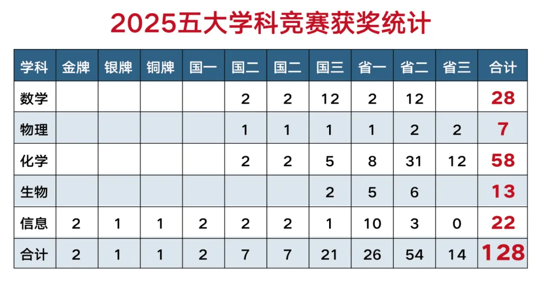 2025年,学校五大奥赛成绩亮眼,斩获全国金牌2枚、银牌1枚、铜牌1枚,国家级奖项18人次,省一等奖26人,累计128人次获省级以上奖项。在南京市普通高中研究性学习成果展示活动中,5项作品获市一等奖;全国青少年航天创新大赛中,斩获国赛4项奖、省赛7项一等奖。校羽毛球队获省锦标赛男团冠军、女团亚军,全国传统学校比赛男团亚军。