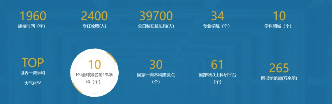 学校办学特色鲜明。大气科学入选国家“世界一流学科”建设学科,气象学为国家重点学科,地球科学、工程学、计算机科学等10个学科进入ESI学科排名全球前1%,其中地球科学、计算机科学、环境科学与生态学、工程学4个学科进入前1‰。拥有大气科学、环境科学与工程、数学、科学技术史、计算机科学与技术、信息与通信工程、管理科学与工程、遥感科学与技术、光学工程、网络空间安全、生态学11个一级学科博士学位授权点,28个一级学科硕士学位授权点。