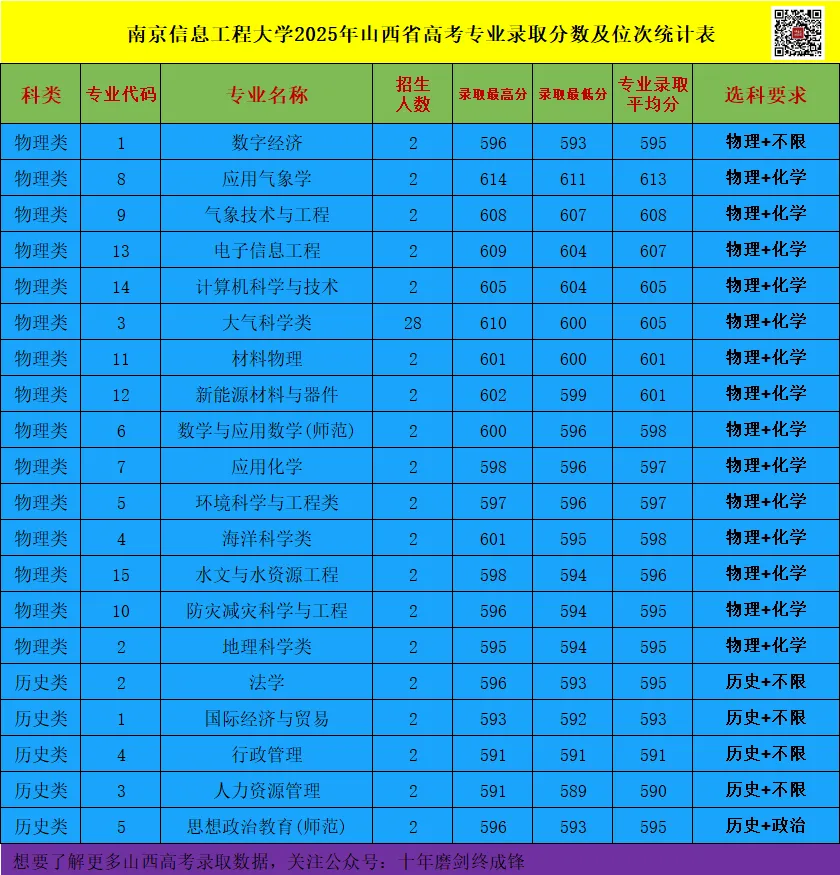 关注高考升学,每天分享2025年山西高考录取院校的专业数据!添加 老师《188 35 000 985》为好友,获取你需要的高考相关数据。 南京信息工程大学是国家“双一流”建设高校,前身为南京气象学院,是新中国创办的第一所气象本科院校,被誉为“气象人才的摇篮”,2004年更名为现名。