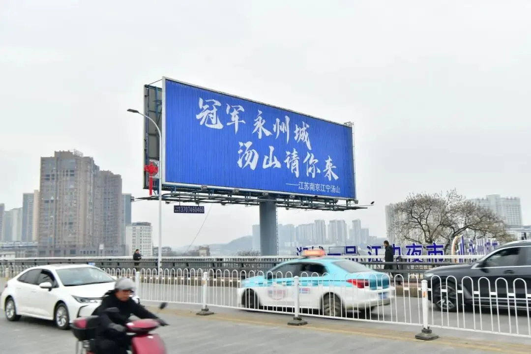 2025年“湘超”中,永州队以草根之姿逆袭夺冠,“永冲锋”的韧劲背后,是平凡人对梦想的坚守、对拼搏的执着,这份精神,与江苏人深耕实干、久久为功的底色高度契合,更与汤山深耕文旅、精益求精的执着同频共振。当江苏各地纷纷以广告牌传递祝福时,汤山选择“另辟蹊径”,不做隔空喊话的旁观者,而做躬身入局的践行者;不复制千篇一律的标语,只定制直抵人心的邀约。“冠军永州城”,是对永州城市精神的解读,是对拼搏力量的由衷赞美;“汤山请你来”,是对两地情谊的真诚延续,是对文化交融的热切期盼。这种精准的情感捕捉,让原本静态的广告牌,成为承载两地精神共鸣的温暖载体。