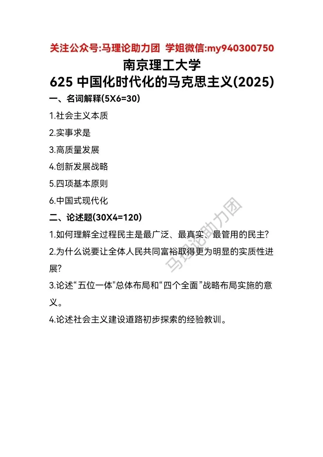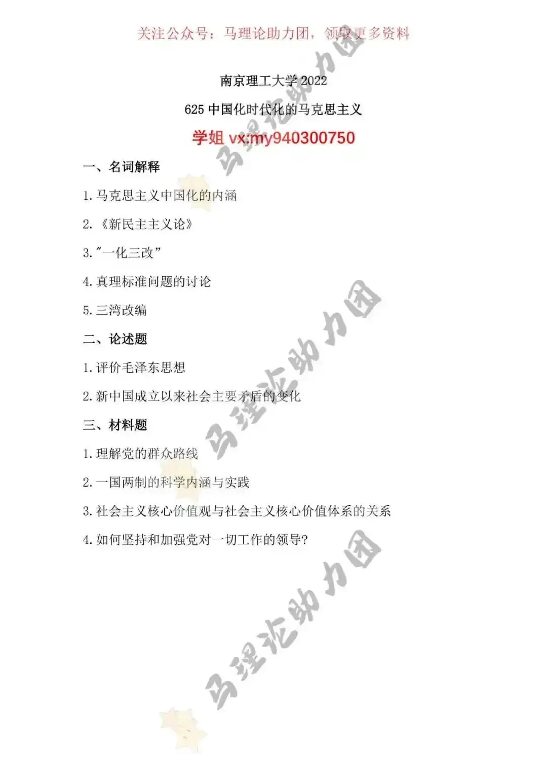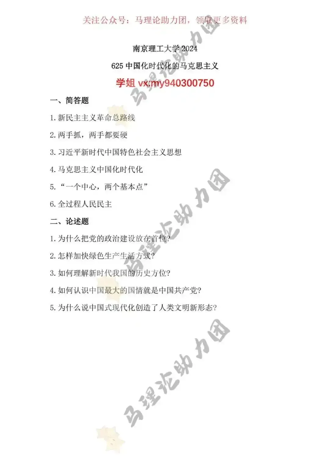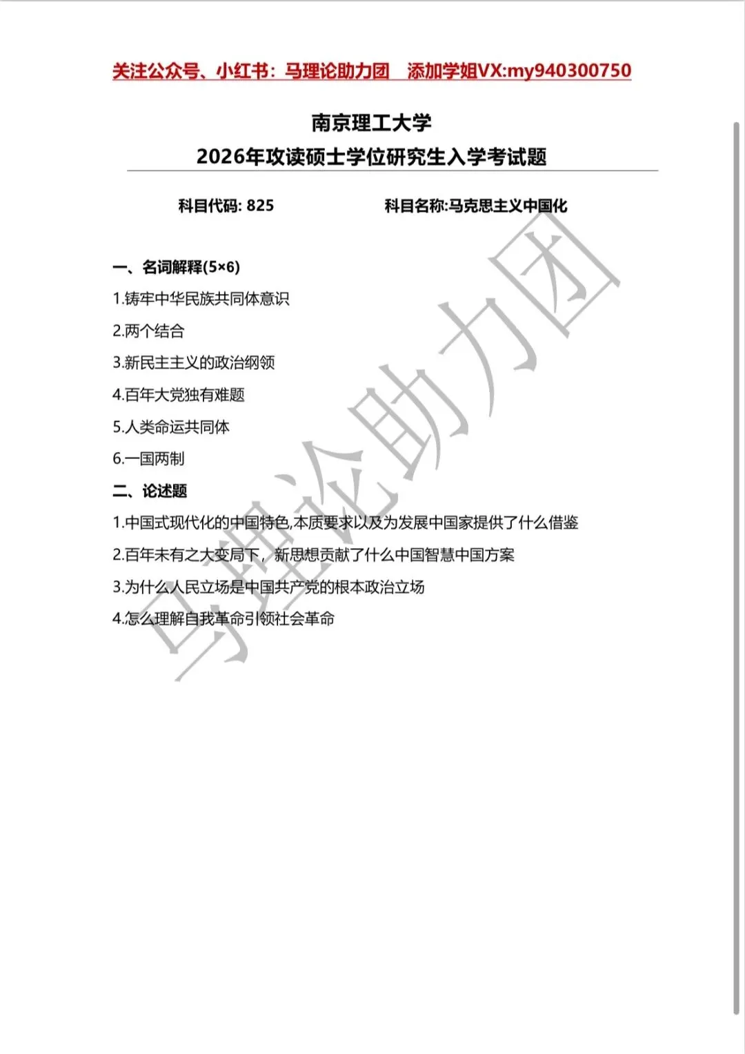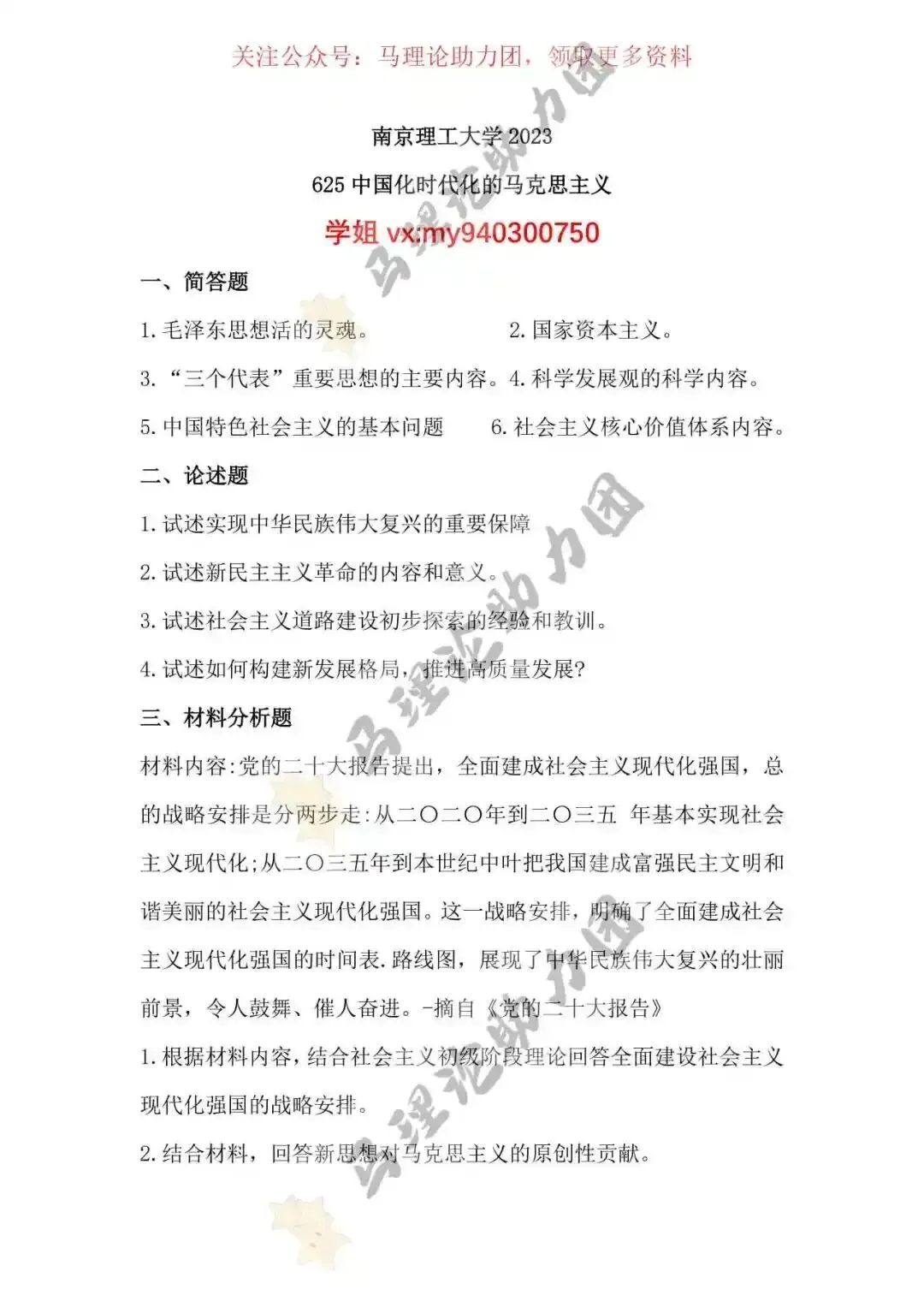 南京理工大学专业课一为中国化时代化的马克思主义,题型不固定,名解、简答、论述、材料分析题目都有涉及,题量适中,题目难度适中。从考察的内容上看,覆盖范围较广,中特、新思想、近代史知识都有涉及。论述题和材料分析题,注重对时政知识、理论前沿的考察,在回答此类问题时,考生需要加上自己对此问题的独立思考。马理论助力团“题文筑梦”活动中的论文解析,每周推送一篇前沿论文,可以帮助考生了解当下热点。