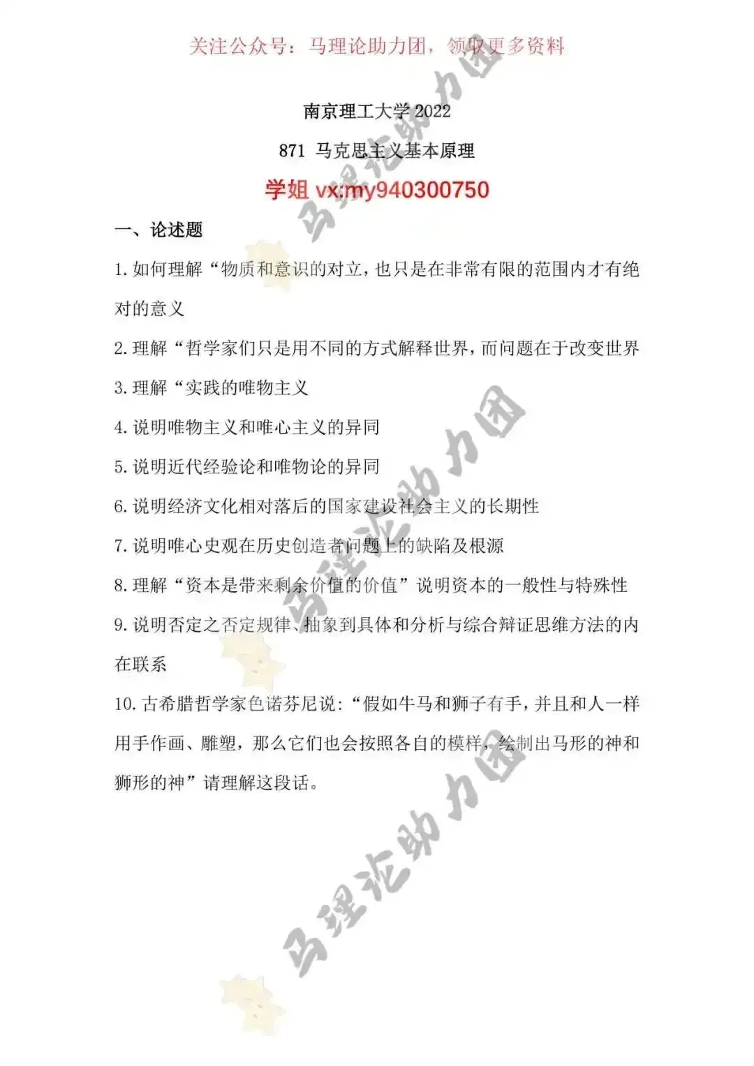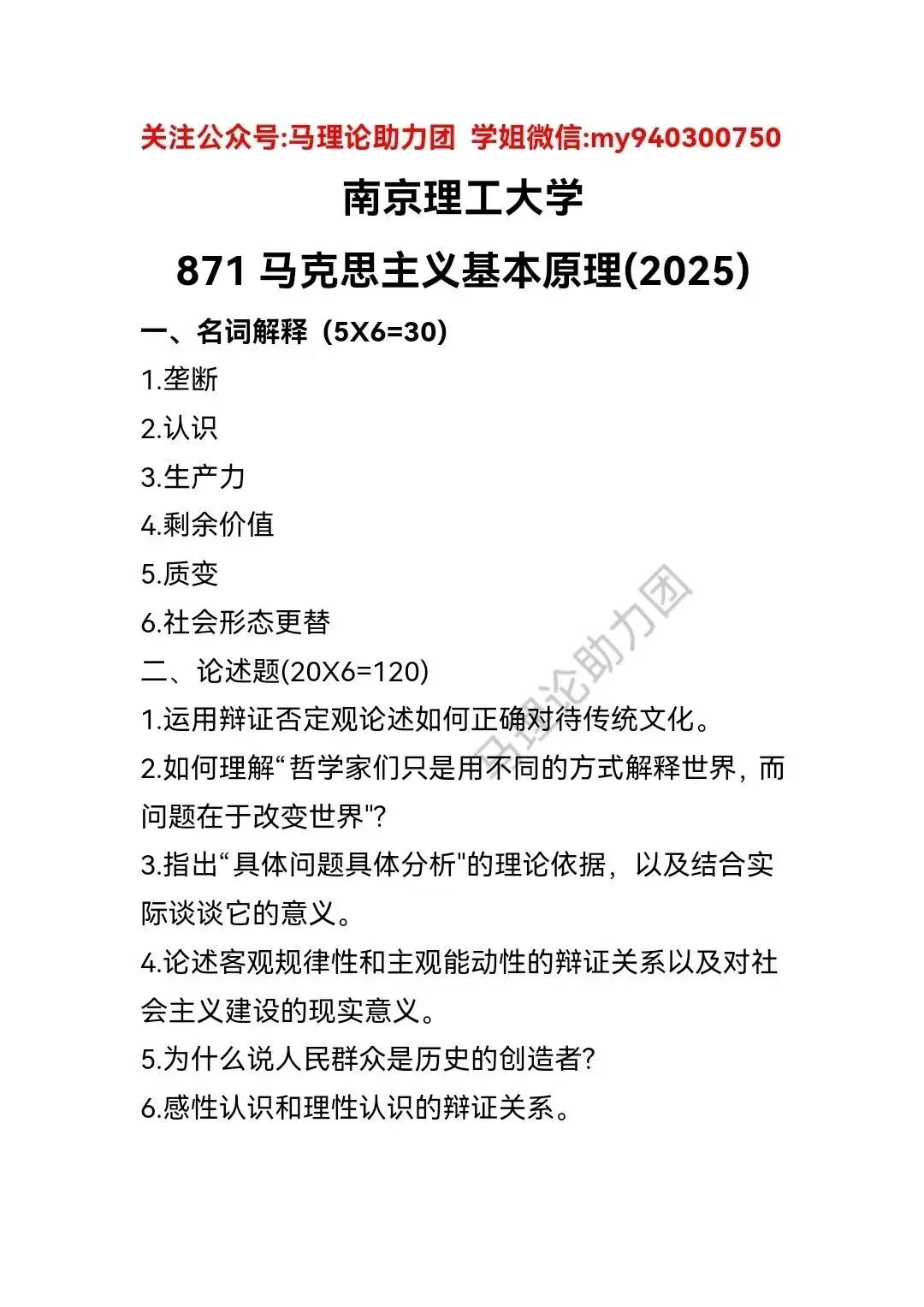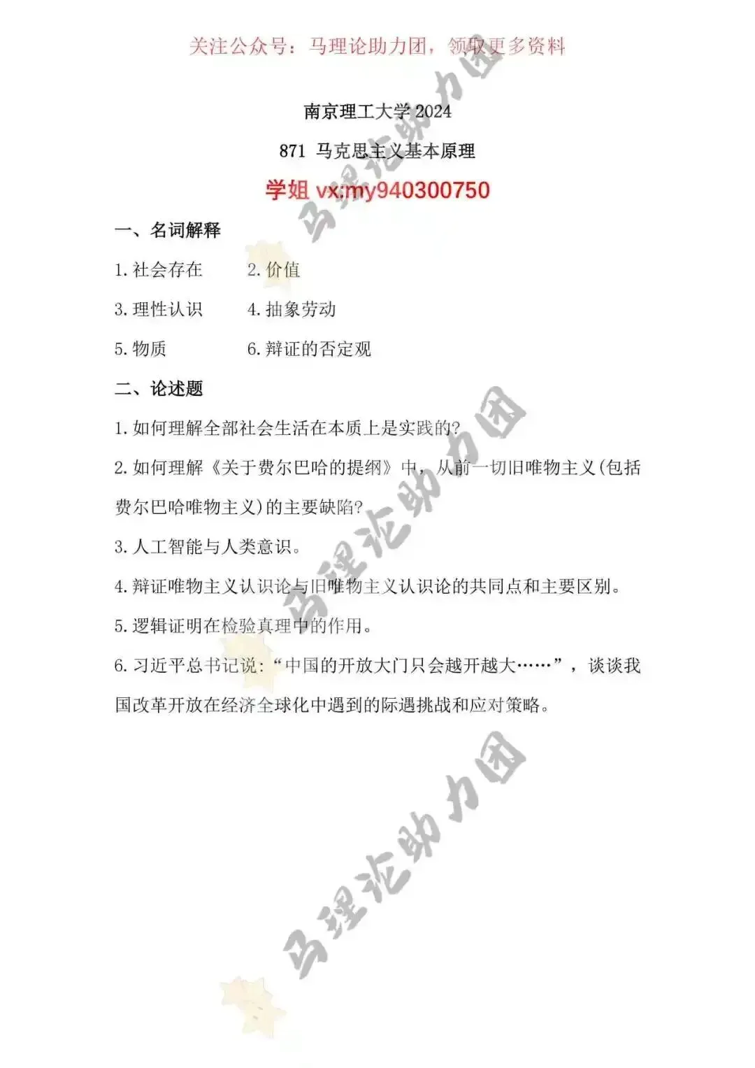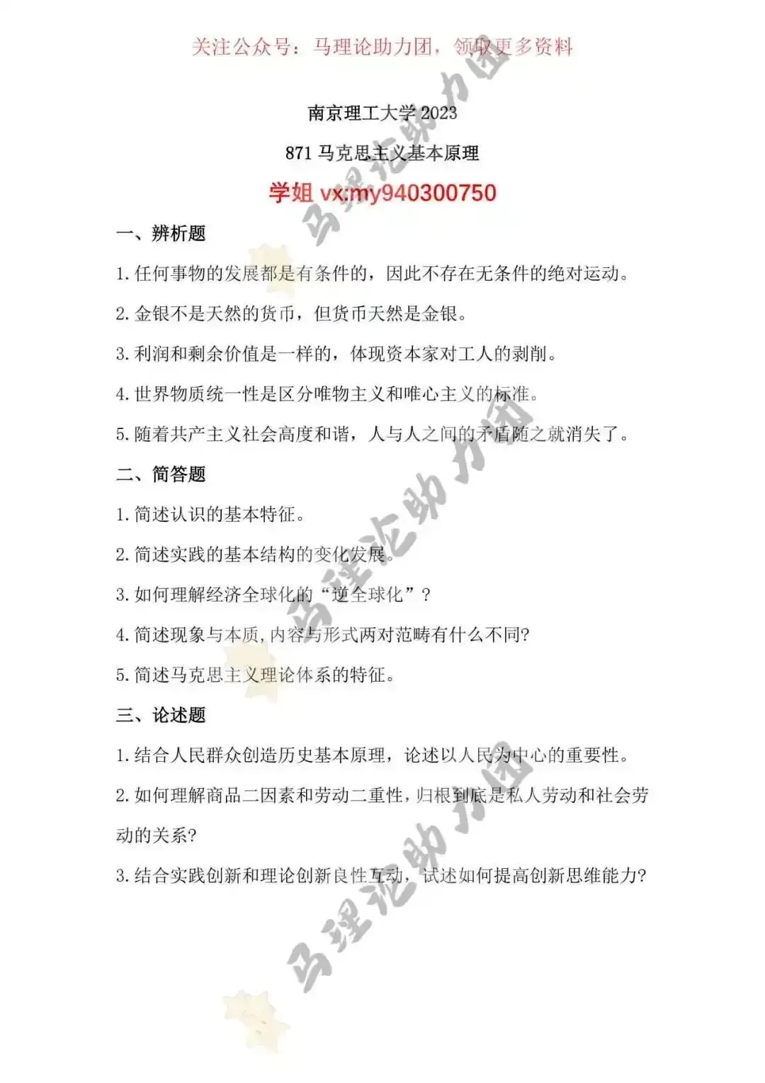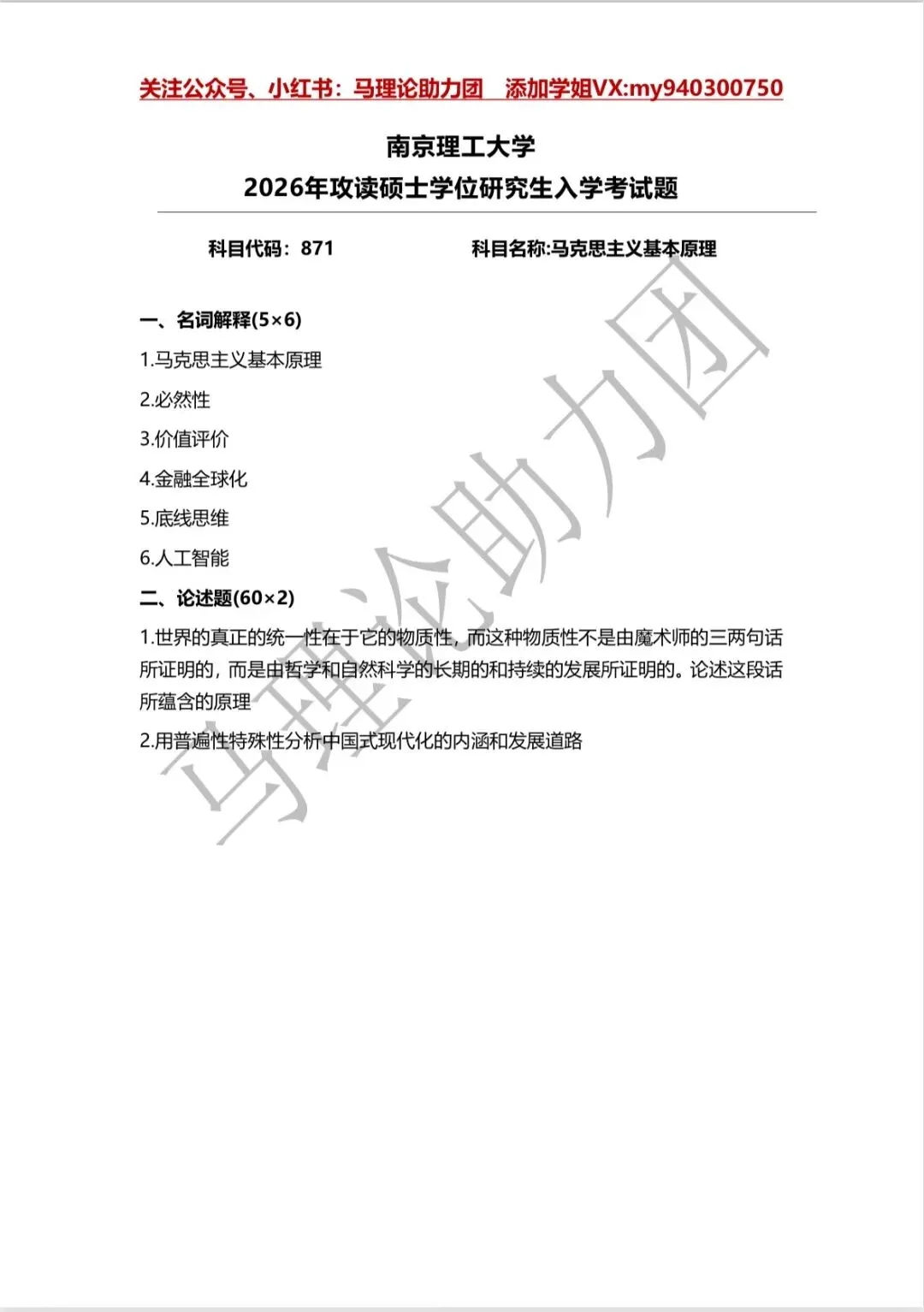 南京理工大学专业课一为中国化时代化的马克思主义,题型不固定,名解、简答、论述、材料分析题目都有涉及,题量适中,题目难度适中。从考察的内容上看,覆盖范围较广,中特、新思想、近代史知识都有涉及。论述题和材料分析题,注重对时政知识、理论前沿的考察,在回答此类问题时,考生需要加上自己对此问题的独立思考。马理论助力团“题文筑梦”活动中的论文解析,每周推送一篇前沿论文,可以帮助考生了解当下热点。