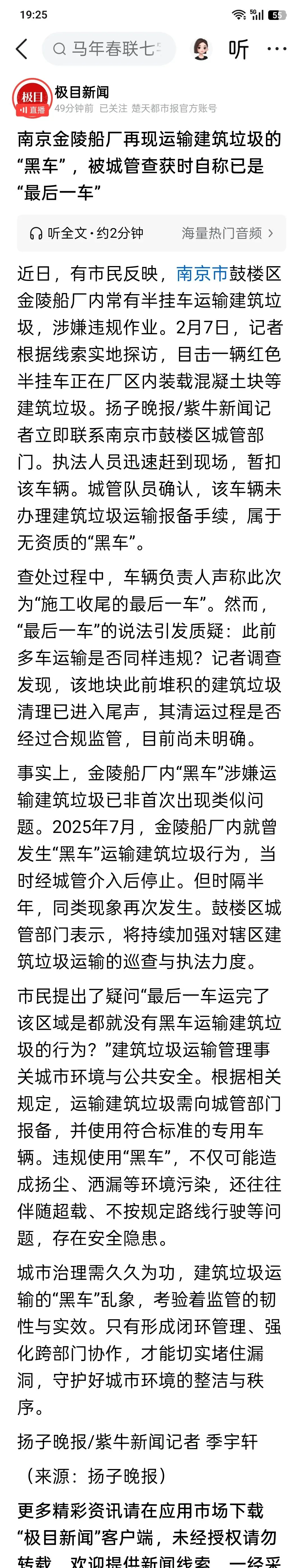 事实上,金陵船厂内“黑车”涉嫌运输建筑垃圾已非首次出现类似问题。2025年7月,金陵船厂内就曾发生“黑车”运输建筑垃圾行为,当时经城管介入后停止。但时隔半年,同类现象再次发生。鼓楼区城管部门表示,将持续加强对辖区建筑垃圾运输的巡查与执法力度。