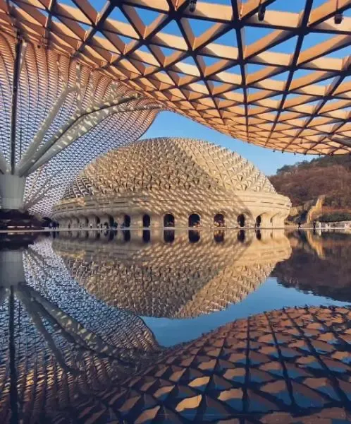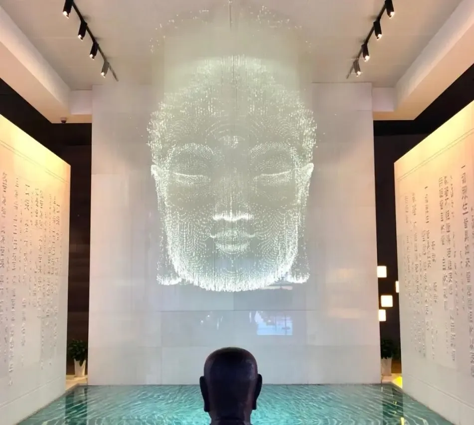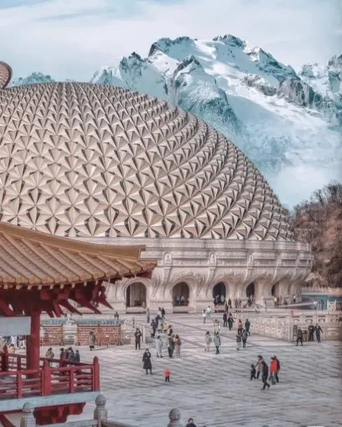 1..佛顶广场玻璃莲花:在玻璃莲花上手机贴紧地面仰拍,佛顶宫全景镜像倒影,值得收藏。