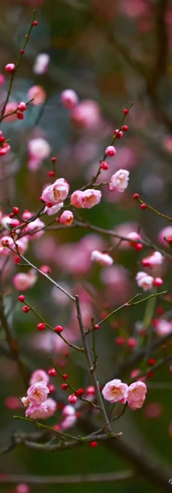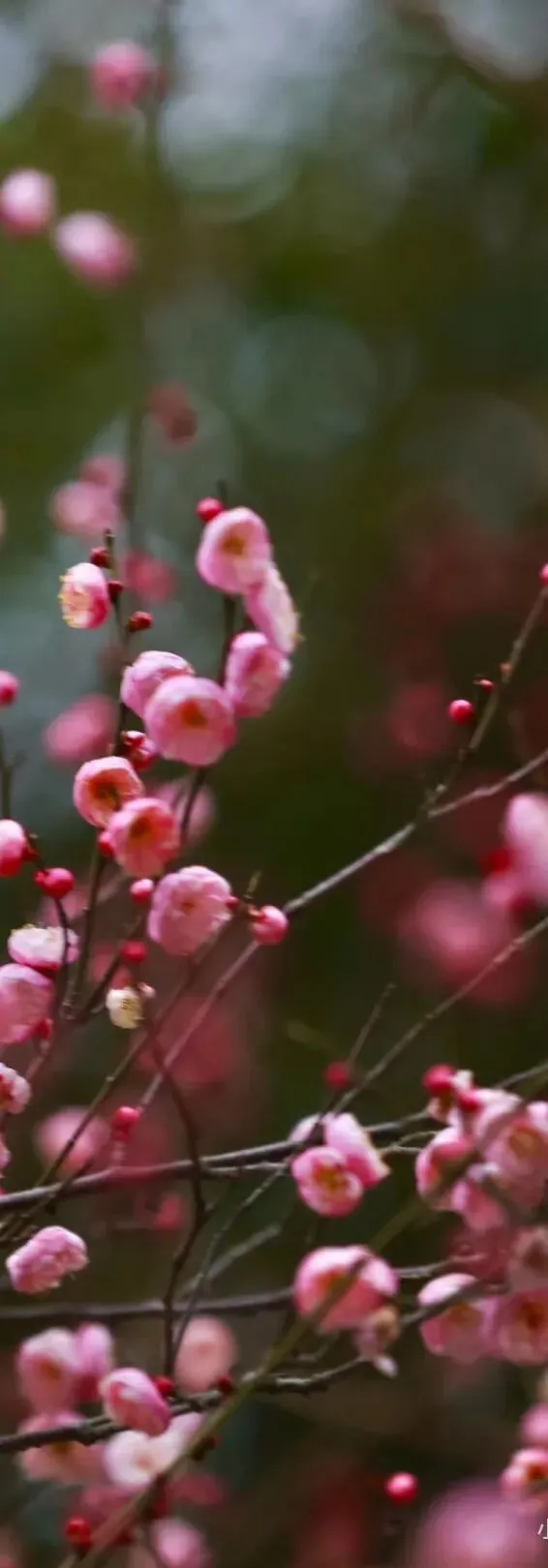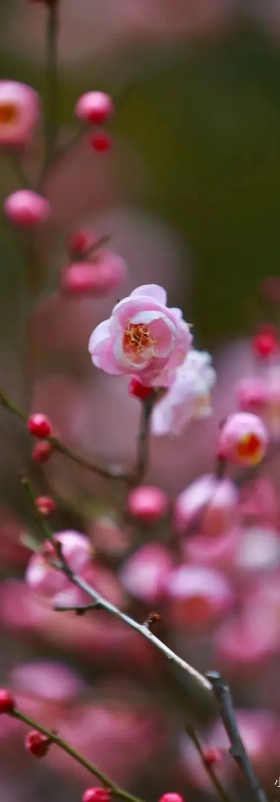 粉红朱砂:属于朱砂品种群。植株是朱砂的特质,但花如其名,深粉红色;花大,碟型略内扣,花瓣约4层,层层紧叠,内瓣常有皱褶;着花密,花期早,是兼具颜值与底蕴的优良品种,亦是梅花山早春赏梅的必打卡款。
