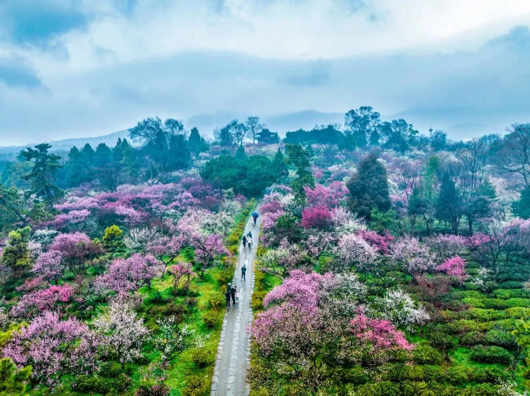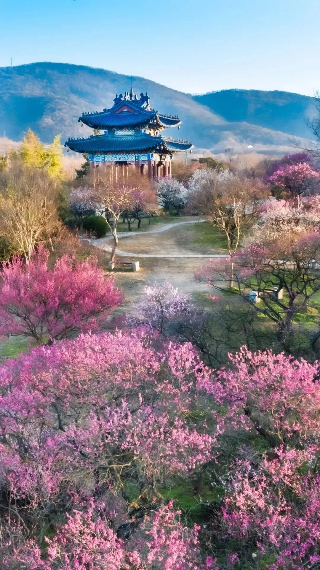 梅花山的万株梅花竞相开放,层层叠叠,云蒸霞蔚,是梅花节举办的主会场。来此踏青赏梅的游人络绎不绝,人们沉醉其中,留连往返。梅花山面积达1533亩,植梅3万多株,共有350多个品种,是名副其实的"天下第一梅山"。漫山遍野的梅花,风乍起时,吹落一身,一不小心就迷失在粉红白相间的花海之中,让人如入古代诗人的意境。