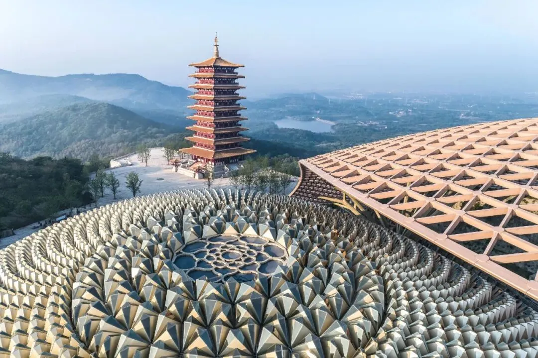 【佛顶宫】作为佛顶圣境区的核心之一,佛顶宫坐落于牛首山西峰之处,建基于历史遗留矿坑之上,总建筑面积约13.6万平方米,与佛顶塔共同构成牛首西峰新景象,与牛首东峰遥相呼应,再现牛首“双峰双阙”并峙的宏伟盛景。