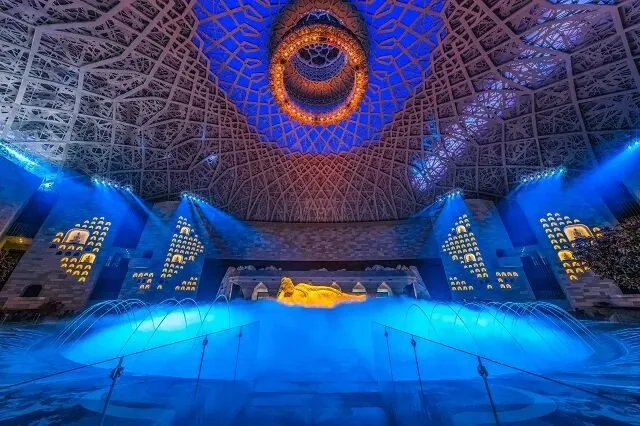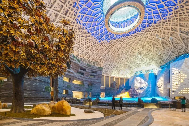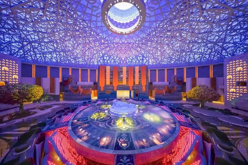 禅境大观的顶部是娑罗穹顶,图案来源于佛陀涅槃时的娑罗树杈。穹顶采用了全覆盖的透光膜和灯光,可以营造出清晨的第一缕晨曦、正午热烈的日光、傍晚的彩霞和入夜的月光。