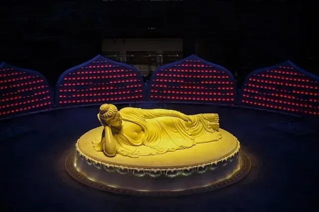 卧佛全长7.5米,采用不锈钢铸造,表皮仿以汉白玉材质。卧佛的造型借鉴于敦煌莫高窟158号窟中的卧佛塑像及其比例,面容庄严而慈祥,同时卧佛还能360度缓慢地旋转,象征佛陀的目光遍照无余。