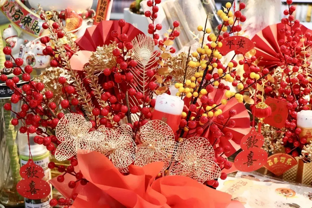 热烈的花啊,配着缕缕红丝带和喜气洋洋的小牌子,年的氛围一下子就出来了。