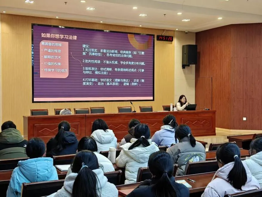 朱海韵、李欣洋开展《在法的门前:认知,选择与启航》专题课程。两位同学以生动案例为切入点,带领现场学生初探法律世界的逻辑与温度,引导大家深入思考法律与日常生活的紧密关联。