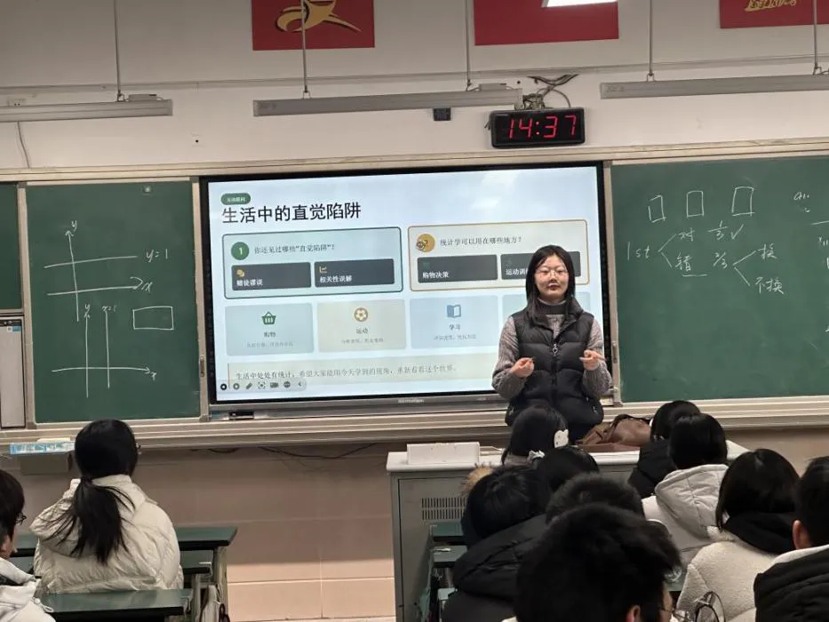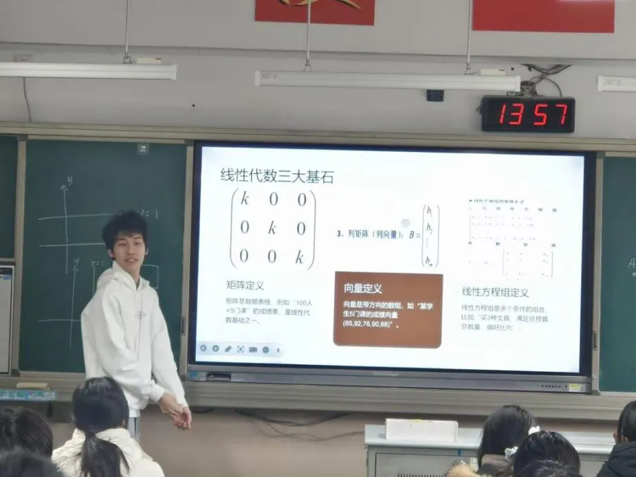 陆丁宇、丁若澄、陶诗雅三位同学共同呈现的《数学之美》课程,分别从应用数学、统计学和线性代数等方向入手,以趣味数学问题为切入点,生动拆解数学在科技、生活等多个领域的实际应用,用通俗讲解打破学生对数学的“枯燥印象”,激发了大家探索数学世界的兴趣与热情。