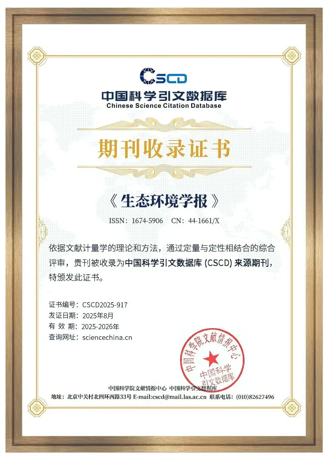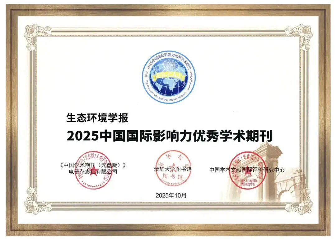 《生态环境学报》是中文核心期刊(2004—2023各版)、中国科学引文数据库(CSCD)核心库期刊、RCCSE中国核心学术期刊、中国科技核心期刊;荣获中国国际影响力优秀学术期刊(2013—2016、2020、2024、2025年)、中国精品科技期刊(2011、2017、2020年)、广东省精品科技期刊、广东省优秀期刊等称号,广东省优秀科技期刊一等奖。进入中国科协组织评选的“生态学领域高质量科技期刊分级目录”T2区,即国际知名学术期刊;位列中国学术期刊影响力指数Q1区(5/83),世界期刊影响力指数(WJCI)Q2区(36/140)。