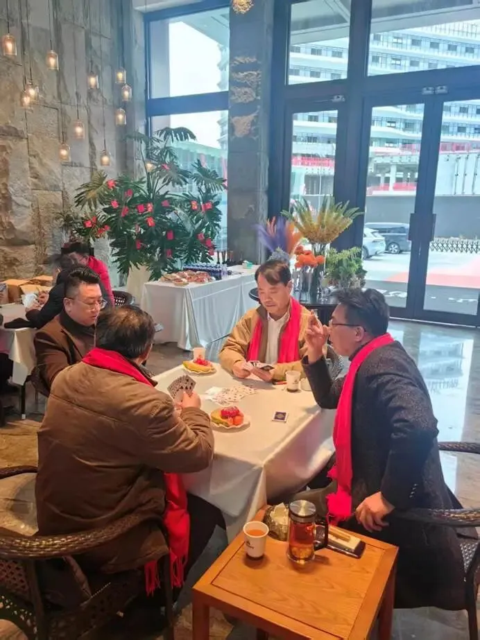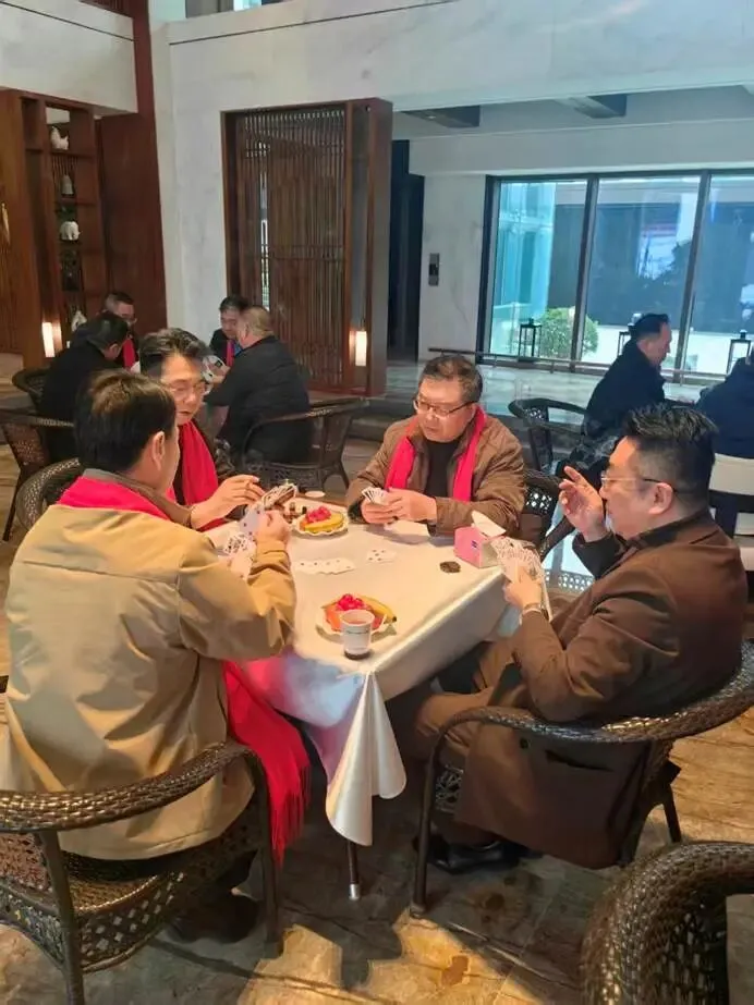 参观环节过后,本次活动的重头戏——掼蛋联谊赛事正式开启,将现场氛围推向高潮。方寸牌桌之上,成为了校友们与各界嘉宾切磋技艺、增进情谊的舞台。南大连云港校友会的邓强、杜有勇、朱亚群、刘翔等校友与复旦、河海、南航等兄弟校友会的伙伴自由组合、默契配合,大家或从容布局、深思熟虑,或巧妙攻防、机智应对,在轻松愉快的氛围中享受着牌桌之趣。现场没有激烈的竞技对抗,只有“友谊第一、比赛第二”的温馨氛围,每一次精彩的配合都引来阵阵喝彩,每一次有趣的失误都化作欢声笑语,冬日的午后,半山・境的会客中心内暖意浓浓、其乐融融。