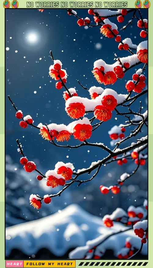 雪飞寒山空,梅绽皑林路。红蕊黄花挂银珠,似眼盈盈处。