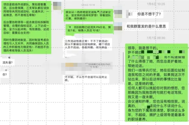 这家公司营销部门的领导,因为是从金基地产组团过去的,大家抱团了然后做事风格异常凌厉。安排员工做事,经常在群里骂人,进行人格侮辱等,搞得部分员工上班十分折磨。