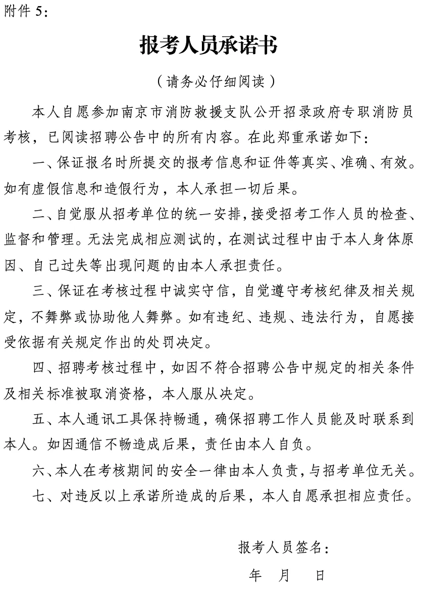 1、此次政府专职消防员招聘由南京市消防救援支队直接组织,信息以南京市消防救援支队微信公众号发布为准,不委托任何代理机构或个人开展招聘工作;本次招聘不指定辅导用书,不收取任何报名考试费用;