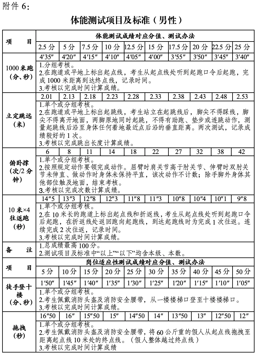 现场资格审查联系方式详见附件4《现场资格审查地址和联系方式》。逾期未上交个人报名材料或者材料不齐、不符合要求的均视为资格审查不合格。资格审查时间:2025年11月10日—2025年11月12日(9:00-11:30、14:00-17:30),应聘人员自行前往。1、体能测试。男应聘者体能测试共4个项目,每个项目占25分,分别为1000米跑、立定跳远、4*10米往返跑、俯卧撑。女应聘者体能测试共4个项目,每个项目占25分,分别为800米、跳绳、仰卧起坐、平板支撑。1000米和800米未取得2.5分以上(含本数)或体能测试总成绩低于40分的不得进入下一环节。参加体能测试需携带本人有效期内的二代居民身份证、《报考人员承诺书》(详见附件5)。2、岗位适应性测试(仅专职队员参加)。共2个项目,分别为徒手登10楼和拖拽,岗位适应性测试满分100分,成绩低于60分的不得进入下一环节。《体能测试、岗位适应性测试项目及标准》(详见附件6)。(四)驾驶技能测试(仅驾驶员参加)。共4个项目,分别为倒车入库、侧方停车、直角转弯、限宽门,驾驶技能测试满分100分,成绩低于60分的不得进入下一环节。《驾驶技能测试项目及标准》(详见附件7)。(五)笔试(仅消防文员参加)。按照计划招聘人数1:5的比例,在通过体能测试的人员中确定参加笔试人员。采取闭卷形式考核,满分100分。笔试合格线为卷面总分数的60分,未达合格线的不得进入下一环节。(六)面试。专职队员按照计划招聘人数1:2的比例,在通过体能测试和驾驶技能测试的人员中确定参加面试人员。消防文员按照计划招聘人数1:3的比例,在通过笔试的人员中确定参加面试人员。面试成绩满分为100分,低于60分的不予招录。 政治审查重点审查招聘对象的政治思想、遵纪守法、道德品质、主要经历,审查了解其家庭成员的政治情况等,政治审查不符合条件的予以淘汰。