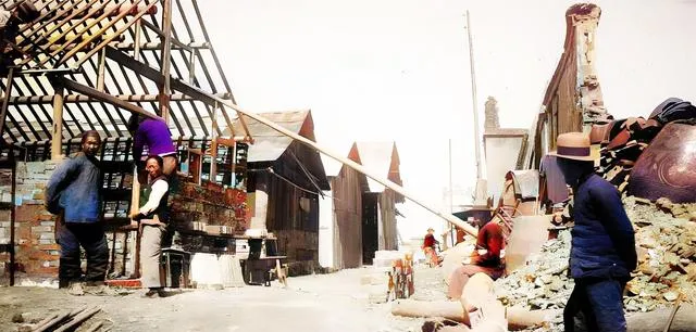 这个架得吱呀作响的木屋是重建时的骨架,木梁呈三角排布,瓦还没上,男人在屋脊间走动,下面的人抬着长杆传递材料,砖墙一截一截断在地上,风一吹灰尘呛人,妈妈说那会儿“先立骨,后盖皮”,先把架子撑住,晚上好歹能挡一阵风。