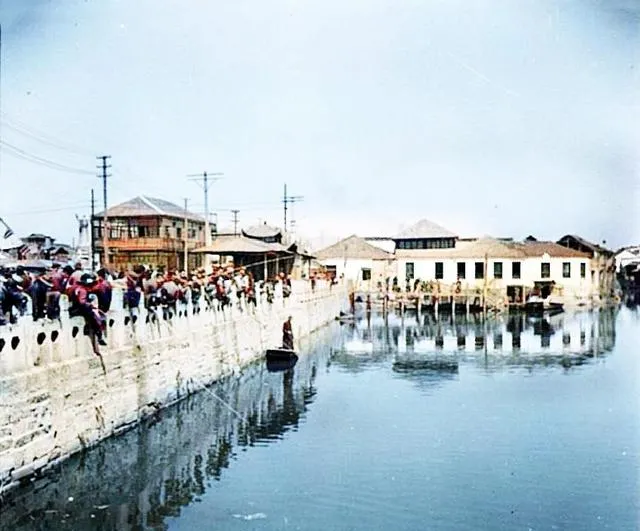 这条水面宽阔的河汊子边,护栏上密密麻麻都是人,孩子踮脚看,老汉拄着拐看,谁家小船贴着岸溜过,桨刃一抬一压,水花亮亮的,小时候我也爱往河边跑,听人讲码头上的旧事,秦淮河就是这么热闹的。
