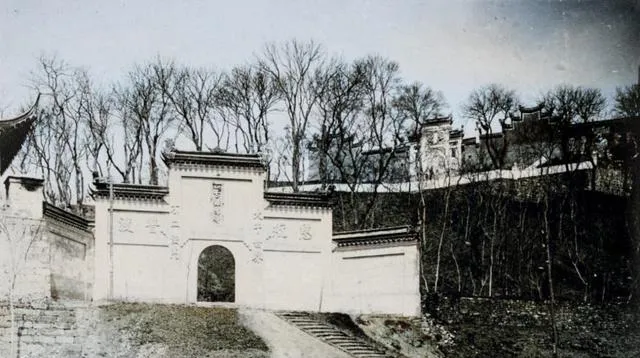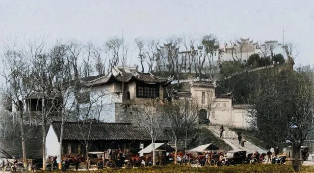 另一角度的鸡鸣寺山门,台阶下停着一排马车,车篷是灰布的,缝线粗,车夫蹲在路边抽旱烟,马尾巴甩一下就带起一撮尘。