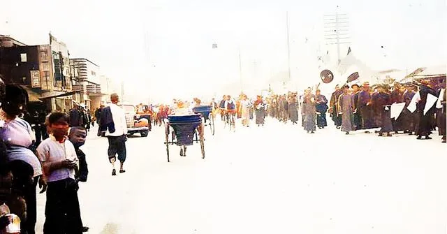 这条明晃晃的大街上,人力车晃晃悠悠,前头有人喊道,后头有人追着生意跑,小贩在摊前吆喝,日本女子坐在车上从旁边穿过,袖口一摆,笑意鲜亮,旁边一队人簇拥着旗子,热闹的外壳里,心里却凉。