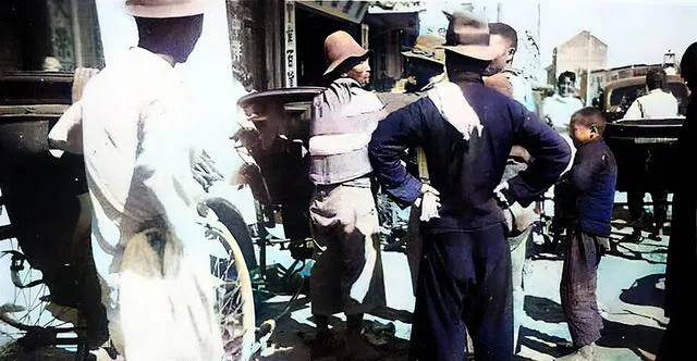 这群围成一团的都是车把式,胳膊搭在车把上喘气,衣角上全是油泥,旁边孩子把手插在袖筒里望着他们,活路少,客人少,话也不多,腰都弯下去了。