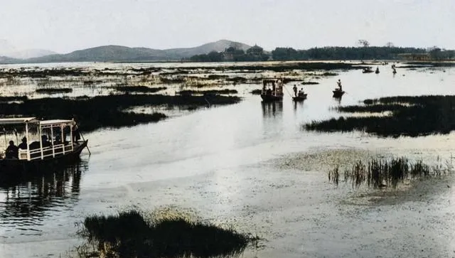 这片水面是玄武湖的浅滩,芦苇一撮一撮冒出来,船停在苇间,像在迷宫里穿行,风吹过来,芦花一下子亮成一片,岸上远处山影淡淡的。