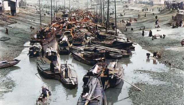 这堆挤成刺猬一样的船就是中山码头旁的河汊,桅杆林立,船与船之间用木板搭着,人从板上走过,挑担的、搬货的、吆喝的,全挤在一线,水位低的时候麻烦就更多,船底都露了鳞。