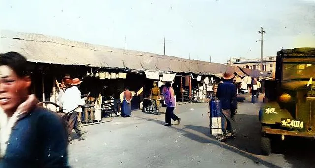 这处搭着长棚子的集市,摊位一溜摆开,右边军车慢慢开过,绿色车头在阳光下发闷光,行人都往边上靠,车辙压在泥里,留下一道道痕。