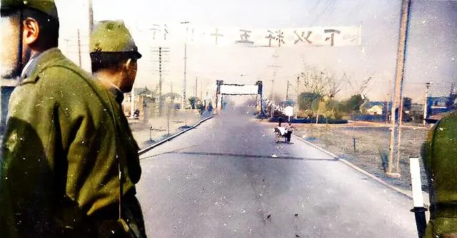 这张照片里,路中央拉着横幅,字迹歪歪扭扭,路口的岗亭像个框,几个军装男子站在前景,朝远处张望,空气里有股绷紧的劲儿。