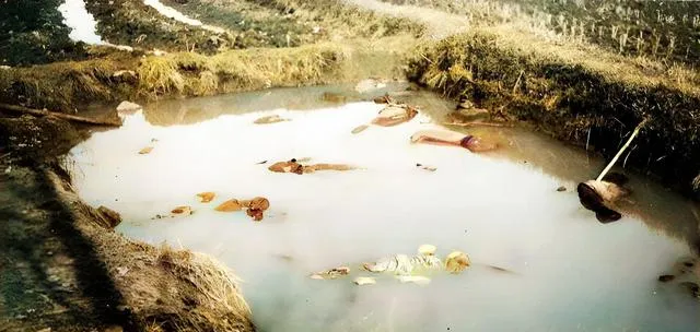 这个浑浊的水塘不愿多看,水面漂着衣物和杂草,岸边草皮被翻烂,太阳照下来也不暖,照片虽然旧,震动却新,历史在这里留下伤口,我们只能记。