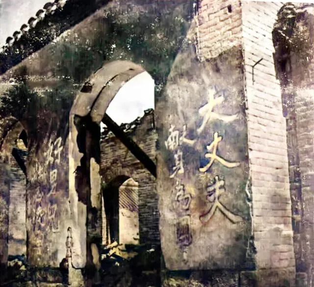 这面烂墙上还能看见几行大字,“大丈夫以身许国”,旁边还有“好男儿志在四方”,字是刷的,手劲大,线条一拐就能看出脾气来,废墟里留这样的字,比什么都硬气。