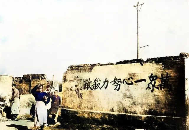 这堵墙更直白,写着**“万众一心杀敌”**,墨迹被风沙刮得发白,墙角站着几个妇人,抬手遮光往这边看,口号写给敌人看,也是写给自己人看。