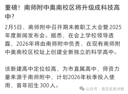 近日,网络上有消息称,2026年南师附中将在现有的奥南校区校址上创建全新独立的科学高中,且为市直属高中,师资力量来源于南师附中,计划今年秋季投入使用,首届招生300人。