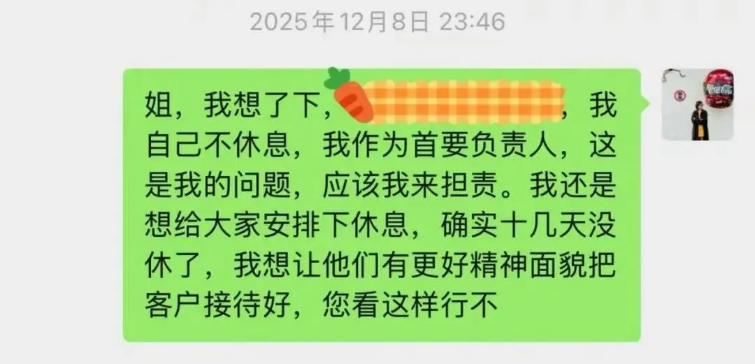 12月8日,团队14天没休息,申请给团队休息,陈某先答应,后又反悔,我说那我不休,让团队休,我上班45天休息了2天。