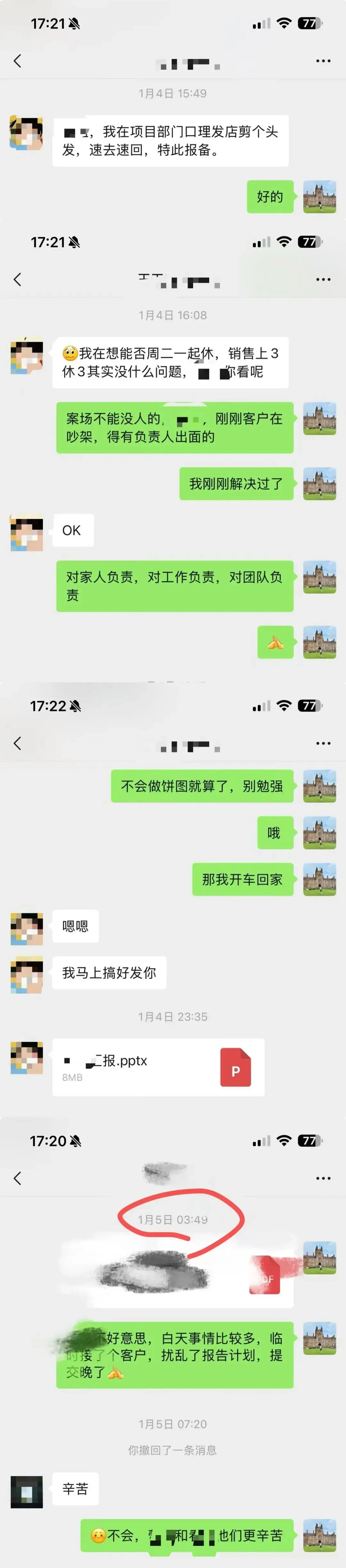 1月4日,销售经理王某划水,我全程陪同处理案场客户纷争。销售经理晚上23:35才提供数据,策划陪我写到次日凌晨02:00,我补充至凌晨03:49并发送,凌晨04:00睡觉;