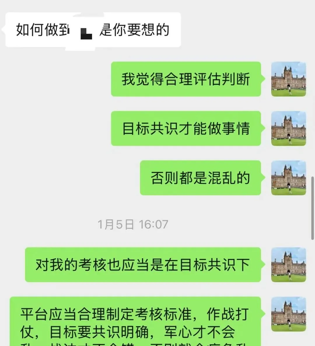 1月指标标准是过往三个月累计的2倍,我认为不合理,和销管产生冲突,她向陈汇报,晚上陈某21:20电话责骂我,将我移出群聊。