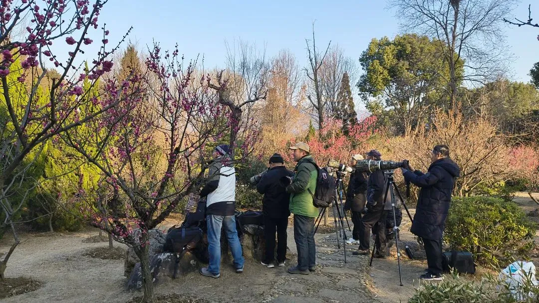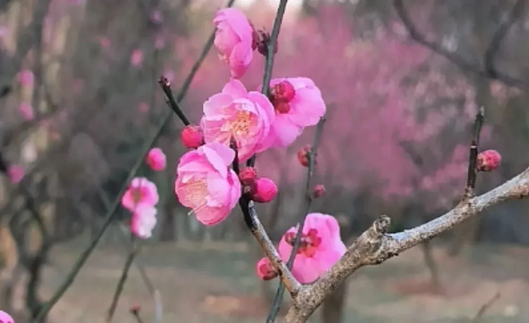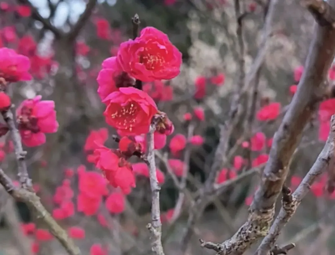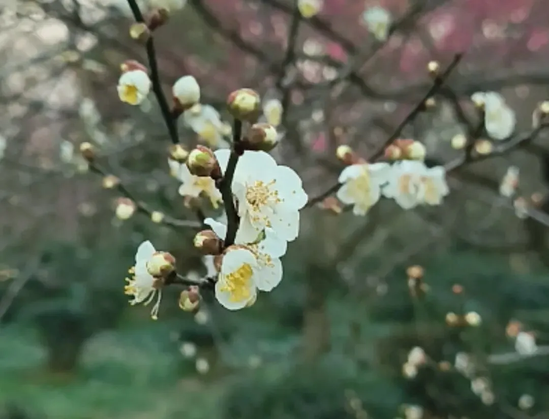 从3号门进入后,就可以看到大片的梅花了,这里就是梅花谷,可步行到惟秀亭欣赏。沿着指示标牌继续前行可以到梅花山,在这里可以欣赏各种品种的梅花,在博爱阁前,还有一株梅王,目前还是含苞待放的状态。
