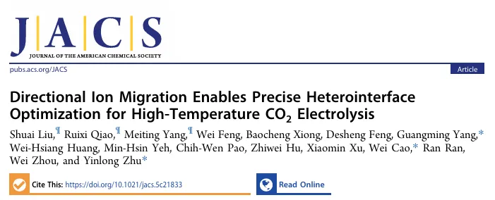 Shuai Liu, Ruixi Qiao, Meiting Yang, Wei Feng, Baocheng Xiong, Desheng Feng, Guangming Yang, Wei-Hsiang Huang, Min-Hsin Yeh, Chih-Wen Pao, Zhiwei Hu, Xiaomin Xu, Wei Cao, Ran Ran, Wei Zhou, and Yinlong Zhu, Directional Ion Migration Enables Precise Heterointerface Optimization for High-Temperature CO2 Electrolysis, Journal of the American Chemical Society, DOI: 10.1021/jacs.5c21833, https://doi.org/10.1021/jacs.5c21833