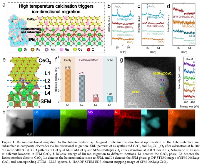 通过高温煅烧诱导Ru离子从萤石相向钙钛矿-萤石异质界面及SFM亚表面定向迁移,实现了异质界面的精确优化。