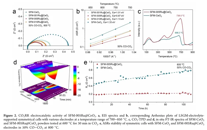 设计并制备了SFM-005Ru@CeO2复合电极,该电极在高温CO2电解过程中表现出极高的电流密度和优异的稳定性,为SOEC电极材料的开发提供了新思路。