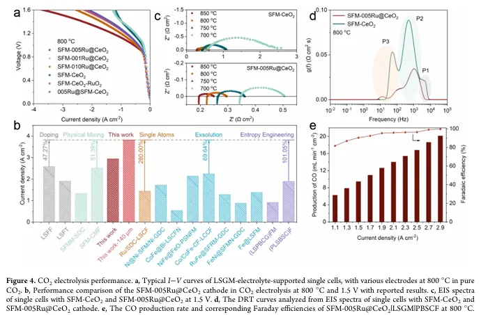 在800°C和1.5 V电压下,使用LSGM(140 μm)电解质的单电池中,SFM-005Ru@CeO2电极的电流密度达到3.80 A cm⁻²,远超所有已报道的电极材料。在相同条件下,SFM-CeO2电极的电流密度仅为1.10 A cm⁻²,表明Ru定向迁移策略显著提升了电极的CO2RR活性。