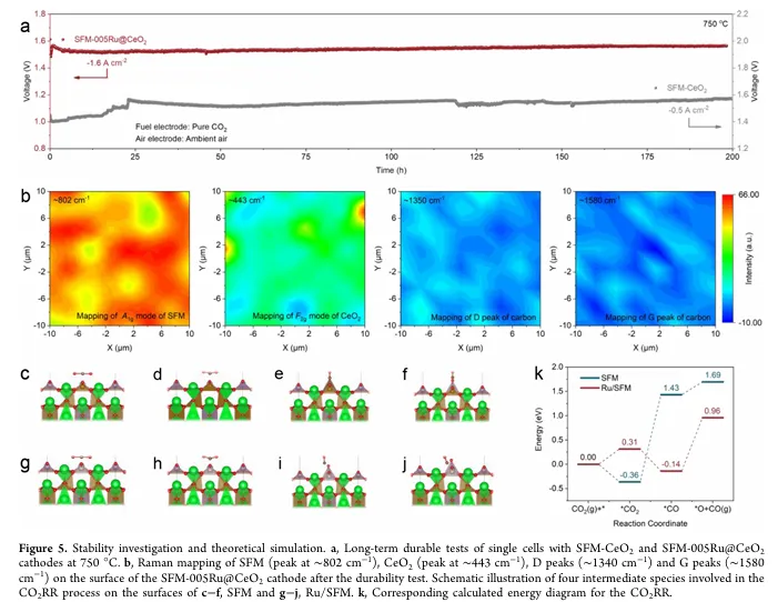 在800°C和1.1 A cm⁻²电流密度下,SFM-005Ru@CeO2电极的CO生成速率为6.26 mL min⁻¹ cm⁻²,法拉第效率为81.74%。当电流密度增加至2.9 A cm⁻²时,CO生成速率提升至20.14 mL min⁻¹ cm⁻²,法拉第效率超过90%,表明电极在高电流密度下仍能保持高效的CO2RR性能。