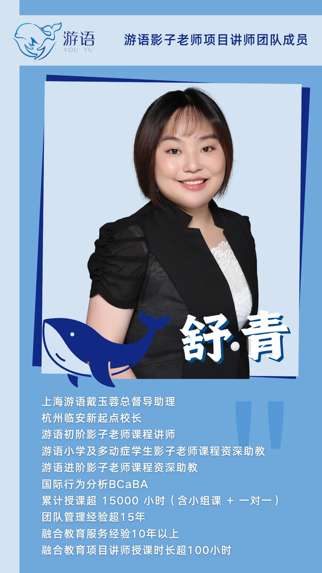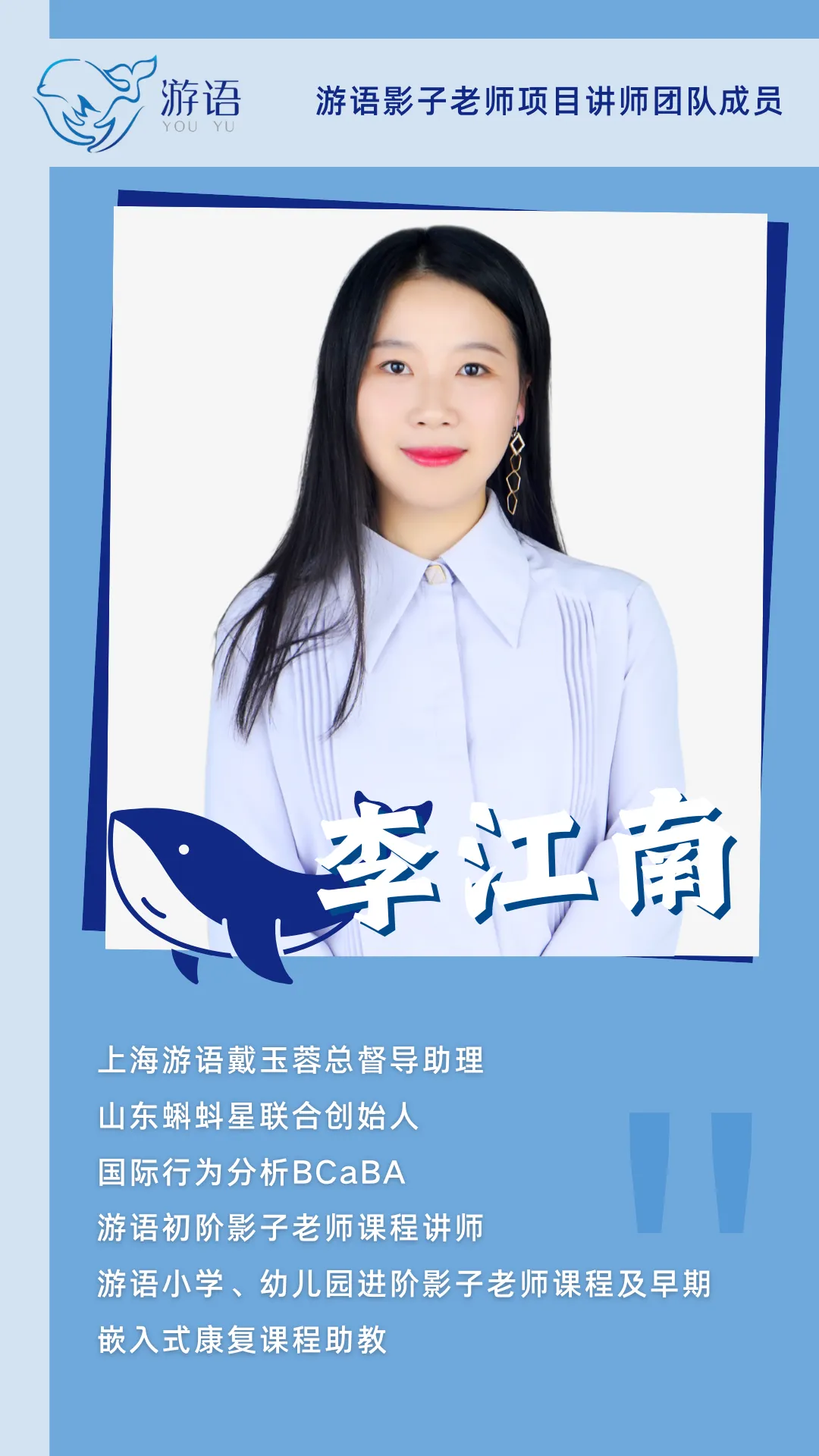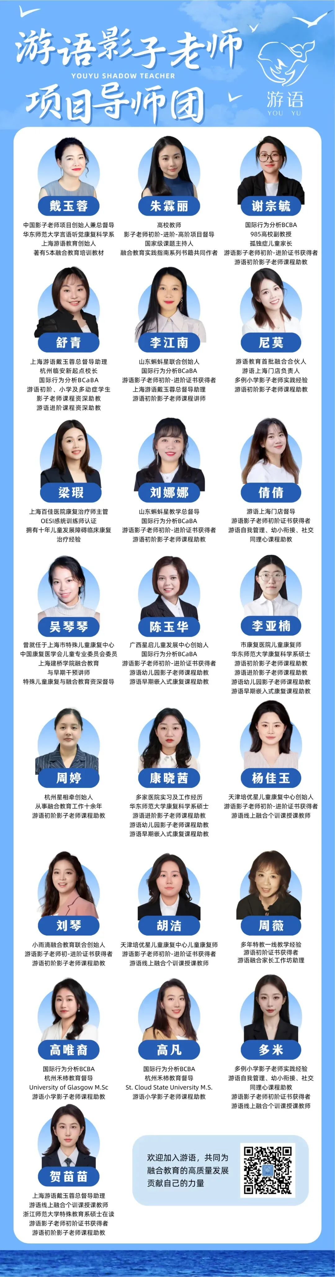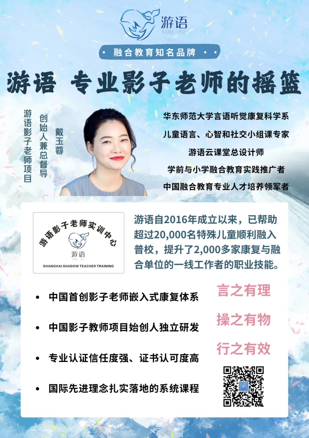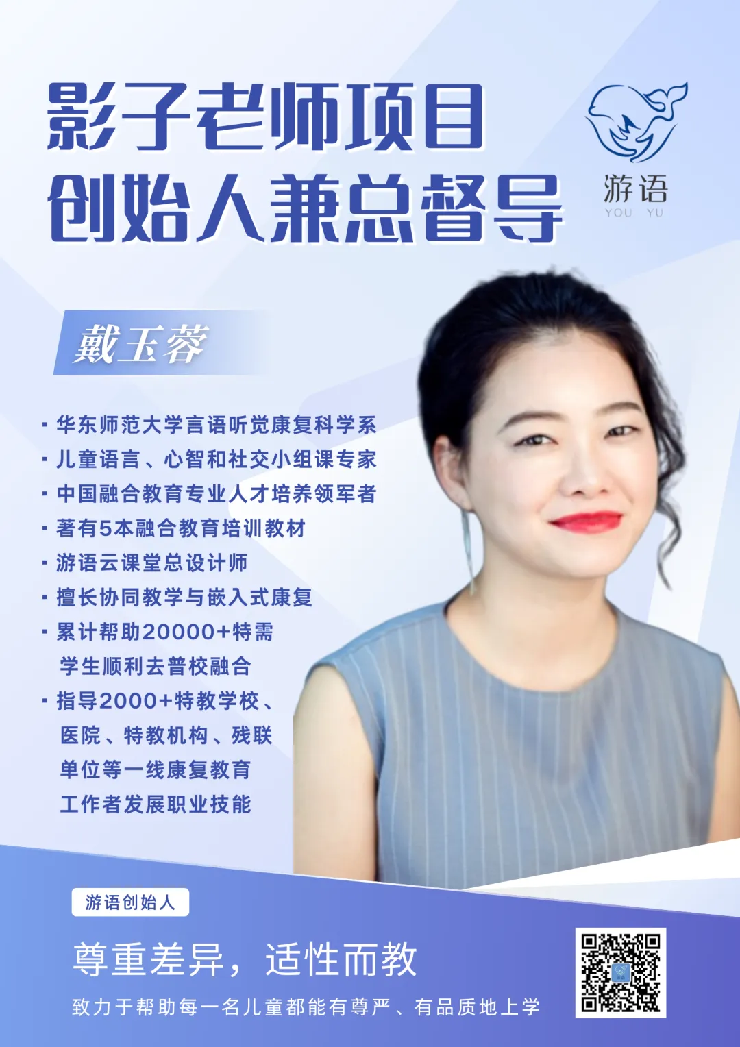 影子老师项目创始人兼总督导,游语教育创始人,儿童语言、心智和社交小组课专家,中国融合教育专业人才培养领军者。
