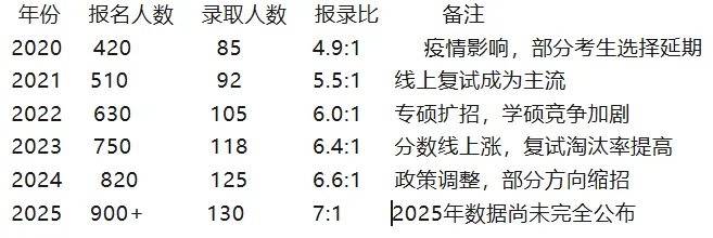 1. 报名人数:预计突破1000人。根据2020-2025年报名人数增长趋势(年均增长约15%),2026年报名人数可能突破1000人,竞争进一步加剧。